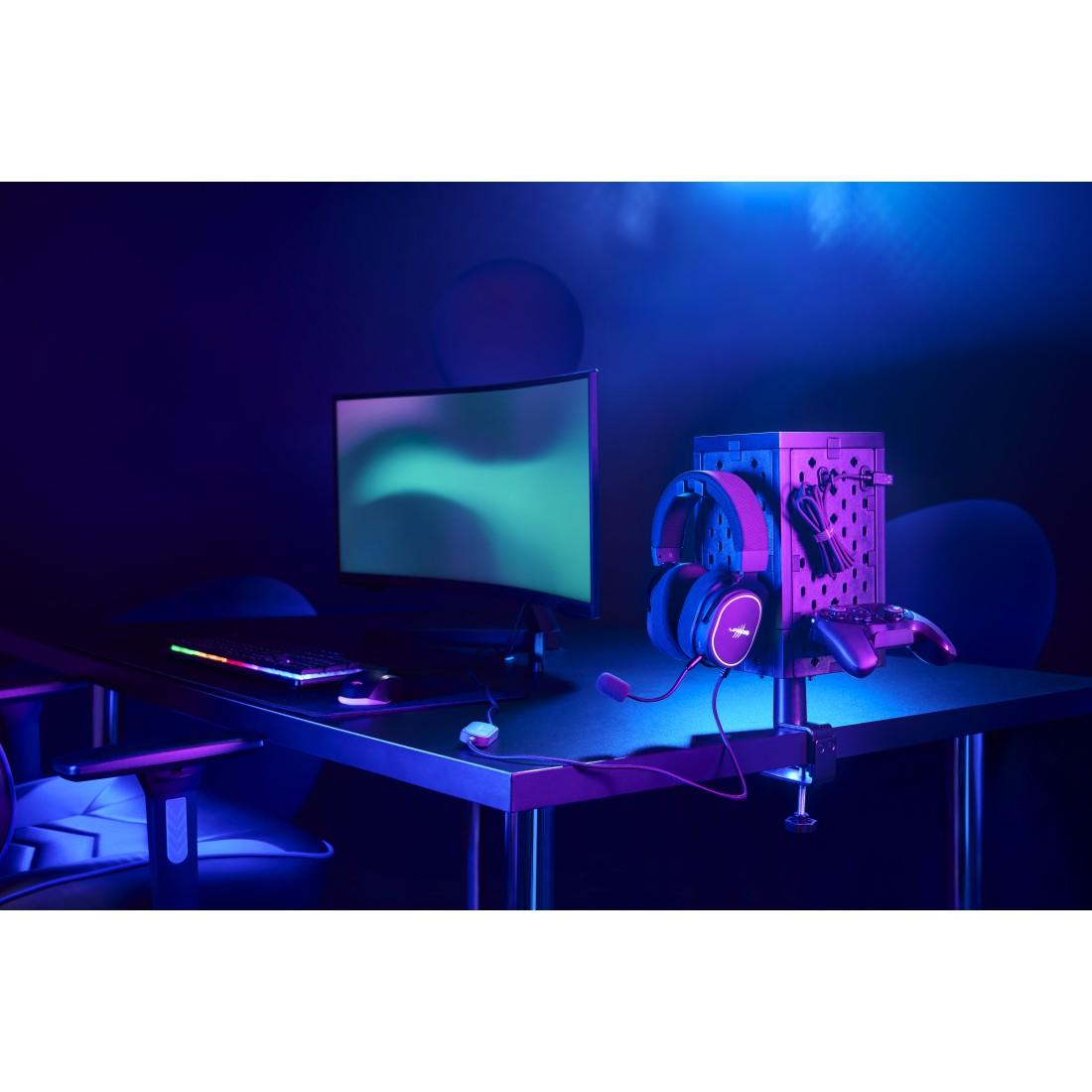 Основни функции Модулен дизайн: Гъвкава plug-in система за персонализиране според нуждите на геймъра Може да се монтира на стена или на бюро Въртяща се стойка за лесен достъп Държачи за аксесоари: 9 различни държачи за слушалки, контролери, кабели и други гейминг принадлежности Осигурява подреден и организиран гейминг сетъп Държач за напитки: Оптимизиран за шейкъри и кенчета Стабилен, без разливане, винаги под ръка Конструкция Материал: Пластмаса и метал Тип монтаж: Clamp / Скоба / Винтово закрепване Максимално натоварване: 1.5 kg Размери и тегло Височина: 73.4 cm Ширина: 15.8 cm Дълбочина: 76 cm (от 68.5 до 76 cm) Тегло: 3160 g Приложение Организация на гейминг аксесоари на бюро Персонализирана настройка на peg board Подреденост и бърз достъп до контролери, слушалки и кабели