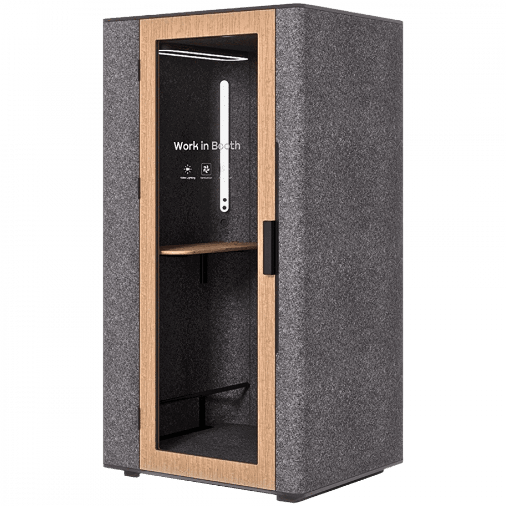 април 1, 2026WORKBOOTH One Acoustic booth with Media hub integration spot, blind back wall, light grey felt, natural oak veneer